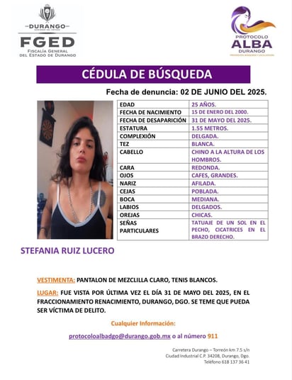 Fue vista por última vez el pasado 31 de mayo, en el fraccionamiento Renacimiento, en la ciudad de Durango.