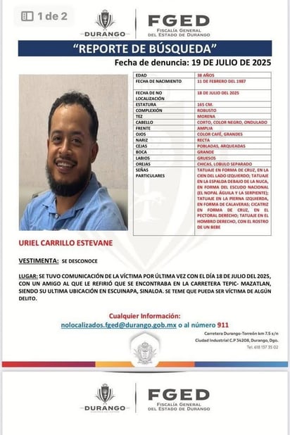 A través de una ficha de búsqueda elaborada por la Fiscalía General del Estado de Durango, y después compartida por la Fiscalía de Sinaloa, se pidió el apoyo de la ciudadanía para localizar a un duranguense que desapareció en la carretera Tepic-Mazatlán.