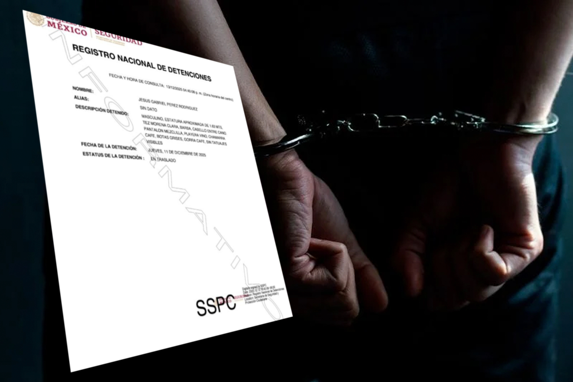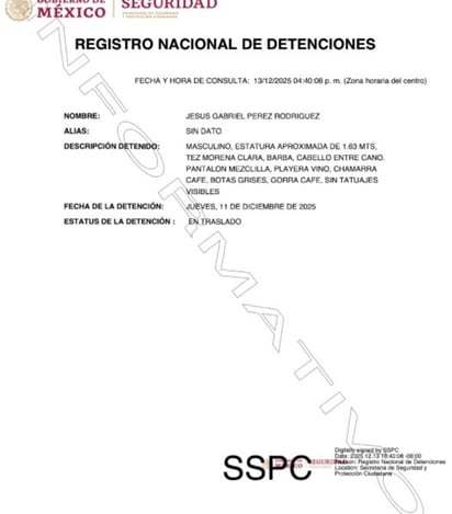 La ficha señala únicamente que fue detenido Jesús Gabriel Pérez Rodríguez, “un masculino, estatura aproximada de 1.63 metros, tez morena clara, barba, cabello entre cano. Pantalón mezclilla, playera vino, chamarra café, botas grises, gorra café, sin tatuajes visibles”.