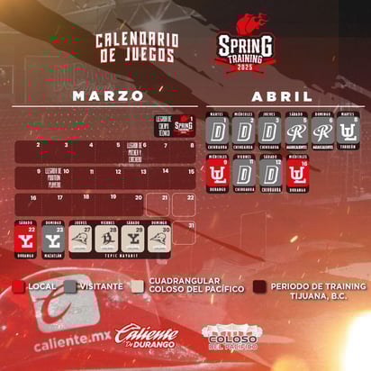 Caliente saltará a escena el próximo 18 de abril en el estadio Francisco Villa ante Saraperos de Saltillo, terminando la serie el 20 de noviembre; el siguiente compromiso a este será en contra de Tecos de los Dos Laredos y tras ello, enfrentarán a Algodoneros de Unión Laguna.