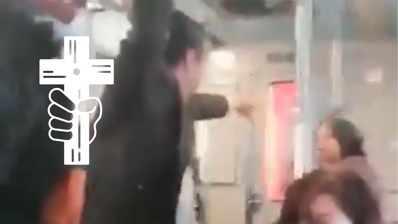 La grabación muestra a un grupo de al menos dos personas que conversa con la una mujer dentro del vagón. Esta misma escena no tardó en hacerse viral puesto que el hombre comenzó a realizar oraciones alzando su mano hacia la mujer, esta misma, en un notable estado de ebriedad o bajo efectos de estupefacientes, le respondió violentamente con golpes con una sombrilla que portaba.