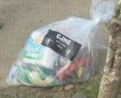 En las bolsas que entregaron se pueden observar productos como: azúcar, galletas, arroz, papel higiénico, latas de atún, sopas. Y una etiqueta que dice "CJNG / octubre 2025".