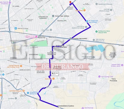 Al tomar esta calle, avanzará hasta prolongación Pino Suárez, donde hará su primera parada del día, en Bodega Aurrerá Durango.
