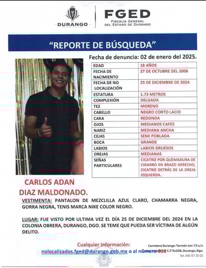 Ante la Fiscalía General del Estado de Durango se presentó una denuncia por desaparición y la ficha de búsqueda de Carlos Adán fue emitida el 2 de enero de 2025.
