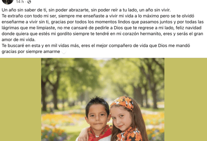 “No me cansaré de pedirle a Dios que te regrese a mi lado, feliz navidad donde quiera que estés mi gordito, siempre te tendré en mi corazón hermanito (…) Te buscaré en esta y en mil vidas más, eres el mejor compañero de vida que Dios me mandó. Gracias por siempre amarme”, finaliza.