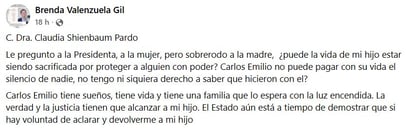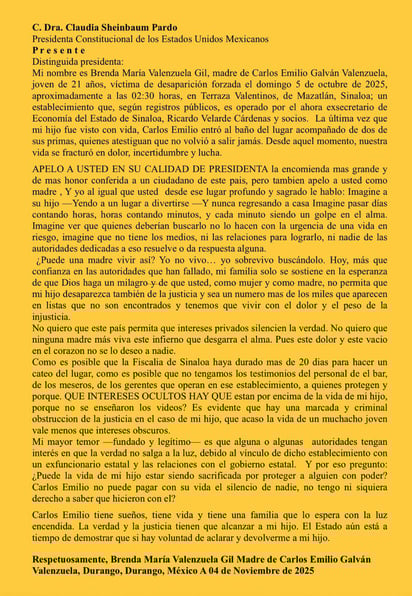 Brenda Valenzuela Gil, madre de Carlos Emilio, un duranguense de 21 años desaparecido desde el pasado 5 de octubre en Mazatlán, Sinaloa, dirigió una carta pública a la presidenta Claudia Sheinbaum Pardo, en la que le suplica su intervención para esclarecer el caso y evitar que, según sus palabras, el silencio y la protección a personas con poder impidan que se haga justicia.