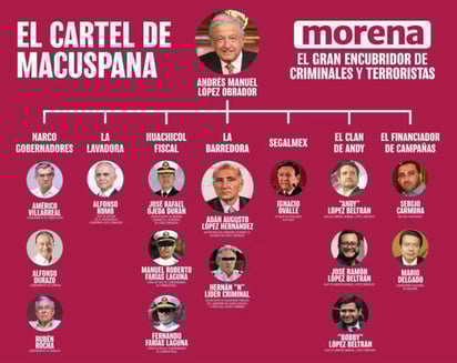Según Moreno Cárdenas, Morena es “el gran encubridor de criminales y terroristas” por tener en sus filas personalidades como Alfonso Romo, jefe de Oficina de la Presidencia y dueño de Vector Casa de Bolsa; Rubén Rocha, gobernador de Sinaloa; así como “El Clan Andy” conformado por Andrés Manuel, José Ramón y “Bobby” López Beltrán, entre otros.