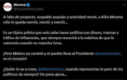 El partido Morena contestó en redes sociales que el PRI, a falta de proyecto, respaldo popular y autoridad moral, acude a las mentiras de Alito Moreno.