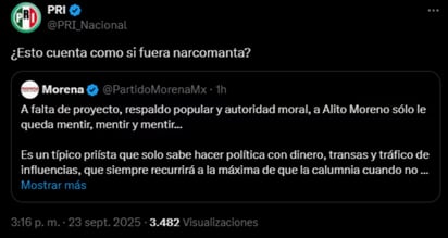 El Partido Revolucionario Institucional, en contraste, reposteó las críticas de Morena con una pregunta: “¿esto cuenta como si fuera narcomanta?”.