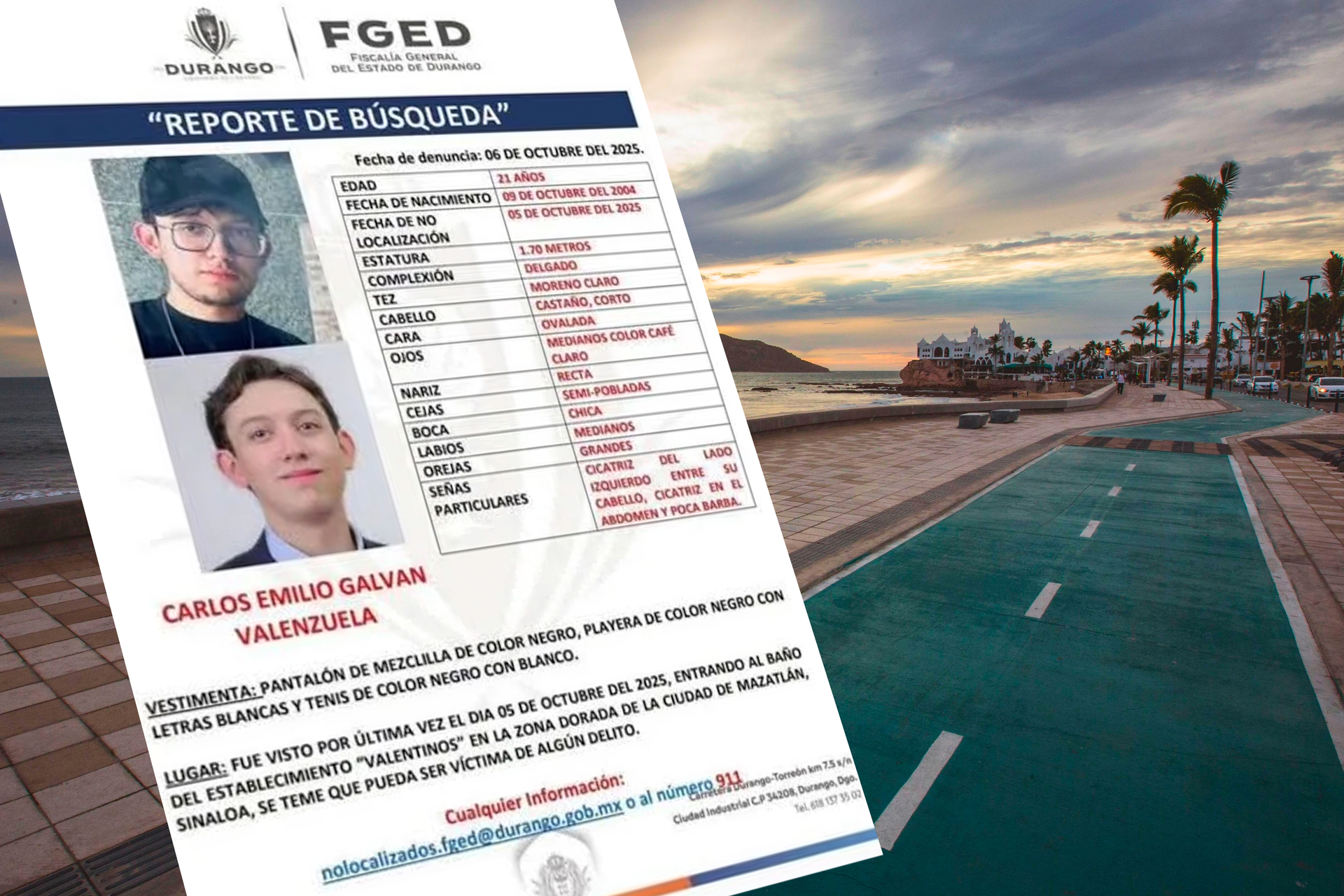 La desaparición del joven duranguense Carlos Emilio Galván Valenzuela, ocurrida el pasado 5 de octubre dentro del bar Terraza Valentino en Mazatlán, dejó de ser un asunto local para convertirse en una herida abierta en el corazón del turismo sinaloense.