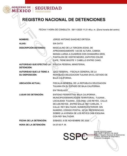 En la descripción es señalado como un hombre de la tercera edad, aproximadamente de 1.65 de altura, portaba una camisa manga larga a cuadros con chamarra gris, pantalón de vestir negro, zapatos color café, tiene bigote y cabello entre cano. La autoridad que lo tiene a su disposición es un juez federal, sin embargo, no se precisa el motivo.