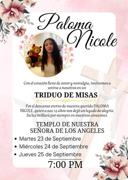 “Nuestras vidas cambiaron para siempre, el día que partiste al cielo.Con el corazón lleno de dolor, pero también con gratitud por toda su luz en nuestras vidas, queremos invitarte a unirte a nosotros en un triduo de misas para honrar la memoria de mi hija amada.Tu presencia y tus oraciones serán un consuelo invaluable en estos momentos.”