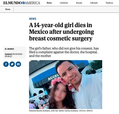 El País (España) — Publicó hoy (23 de septiembre) un reportaje que detalla la secuencia de la cirugía, la denuncia del padre y el contexto de clínicas estéticas irregulares; pone el caso en clave de salud pública.