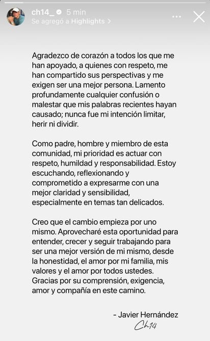 A través de Instagram, publicó el texto en donde asegura que se malinterpretó lo que dijo y que “nunca fue su intención limitar, herir ni dividir”, pues él como padre y ciudadano desea ser parte de un diálogo constructivo, pero que aprovechará esta experiencia para crecer personalmente.