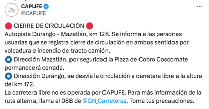 Como parte del protocolo de seguridad, se determinó el cierre total de la circulación en ambos sentidos de la vía. El tránsito con destino a Durango fue desviado a partir del kilómetro 172.