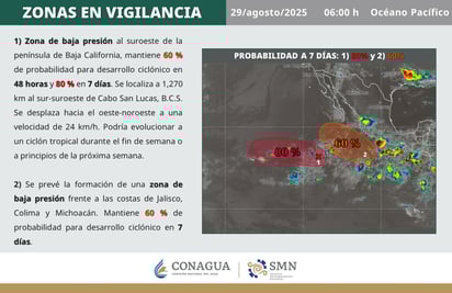 De acuerdo al pronóstico del SMN, la primera de estas zonas de baja presión con potencial ciclónico mantiene un 60 por ciento de probabilidad de formación en las próximas 48 horas, y de 80 por ciento en siete días, mientras que la segunda de estas zonas de vigilancia tiene un 60 por ciento de posibilidad de desarrollo ciclónico en los próximos siete días.