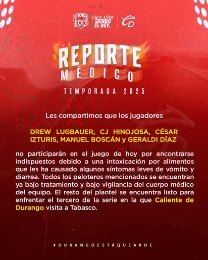 Este jueves, el equipo de Caliente de Durango sufrió algunas bajas previó al enfrentamiento ante Tabasco, debido a que presentaron algunos malestares.