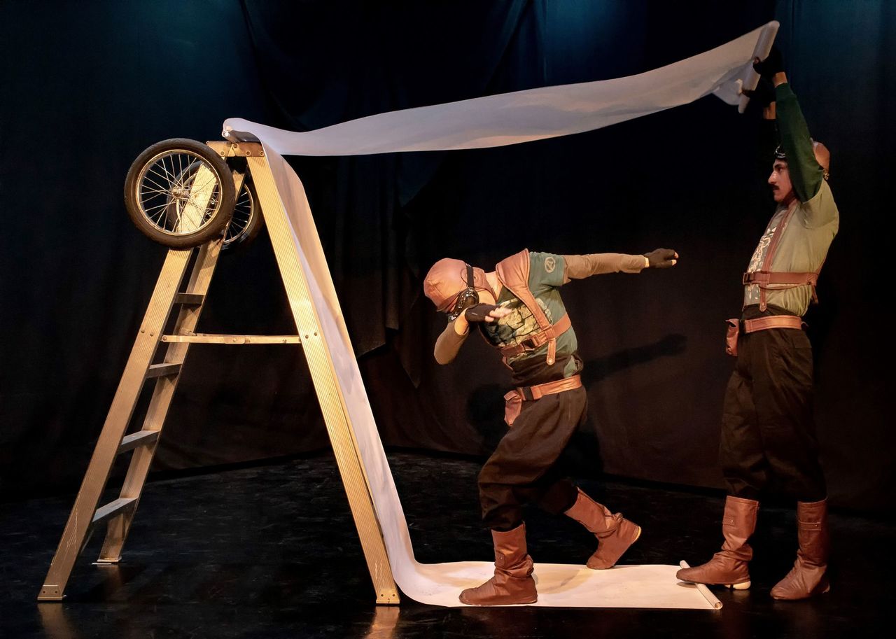 En "La Tierra azul como una naranja", dos intrépidos aviadores emprenden un viaje donde la imaginación es el único mapa, con una simple hoja de papel descubren formas ocultas, trazan rutas invisibles y transforman el espacio en un universo de posibilidades.