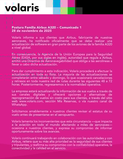 Durante la tarde-noche del viernes 28 de noviembre, la aerolínea Volaris publicó un comunicado alertando a sus clientes de la cancelación de algunos vuelos.