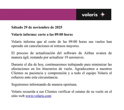 Al corte de las 09:00 horas de este sábado, la aerolínea emitió una actualización, en donde hace del conocimiento a sus clientes que los vuelos han operado sin cancelaciones ni retrasos mayores.