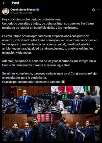 “Hoy concluimos otro periodo ordinario más. Un periodo con altas y bajas, de debates intensos que nos llevó a un resultado de legislar en beneficio de las y los mexicanos”, escribió el legislador morenista en su cuenta de X.