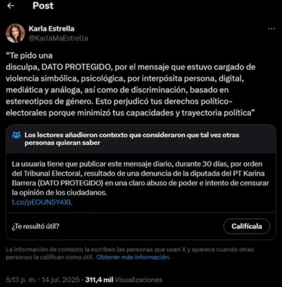 - "Te pido una disculpa, DATO PROTEGIDO, por el mensaje que estuvo cargado de violencia simbólica, psicológica, por interpósita persona, digital, mediática y análoga, así como de discriminación, basado en estereotipos de género. Esto perjudicó tus derechos político-electorales porque minimizó tus capacidades y trayectoria política", ha publicado diariamente Karla Estrella.