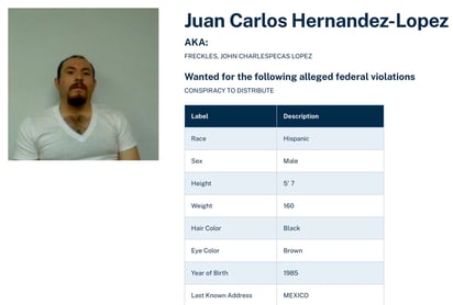Juan Carlos Hernández López, también conocido por los alias ‘Freckles’ y ‘John Charlespecas López’ según la ficha oficial de la DEA, fue incluido en la lista de los más buscados por el delito de conspiración para distribuir sustancias controladas en los estados de Iowa y Missouri. Las investigaciones federales lo vinculan con redes de distribución interestatal de metanfetamina y cocaína, operando fuera de estructuras de cártel pero con conexiones logísticas que facilitaron el tráfico en el medio oeste estadounidense.