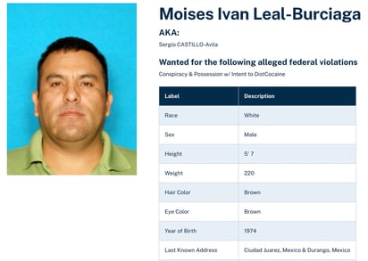 Moisés Iván Leal Burciaga, también identificado por la DEA con el alias Sergio Castillo Ávila, es buscado por conspiración y posesión con intención de distribuir cocaína en el estado de Texas. Las investigaciones federales lo vinculan con redes de tráfico que operaban entre México y el sur de Estados Unidos, particularmente en rutas que conectan Durango con Ciudad Juárez, zona clave para el trasiego de narcóticos hacia El Paso.