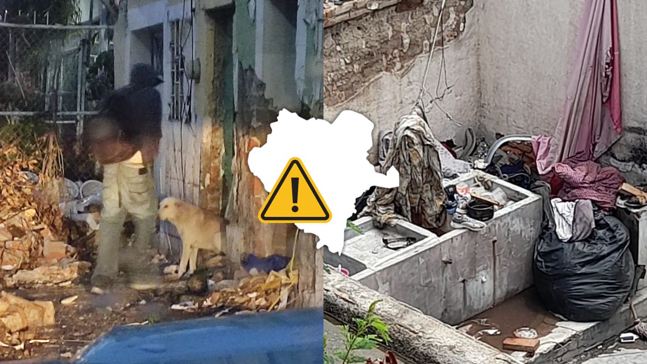El domicilio, marcado con el número 913, es ocupado por personas en situación de calle, quienes han tomado como refugio este inmueble en ruinas, junto con algunas mascotas que los acompañan.
