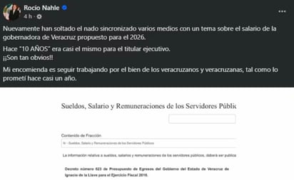 La gobernadora de Veracruz, Rocío Nahle García (Morena), defendió el aumento a su salario a partir del 2026 y exhibió un tabulador salarial del 2016, cuando gobernada el priista Javier Duarte de Ochoa.