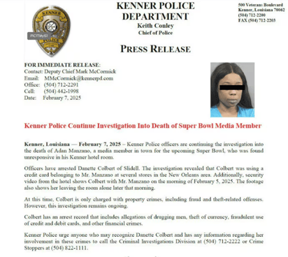 “Oficiales arrestaron a Danette Colbert de Slidell. La investigación revela que Colbert estaba usando una tarjeta de crédito que pertenecía al señor Manzano en varias tiendas en el área de Nueva Orleans”, se lee en un comunicado para la prensa, que dio a conocer el departamento de policía de Kenner.