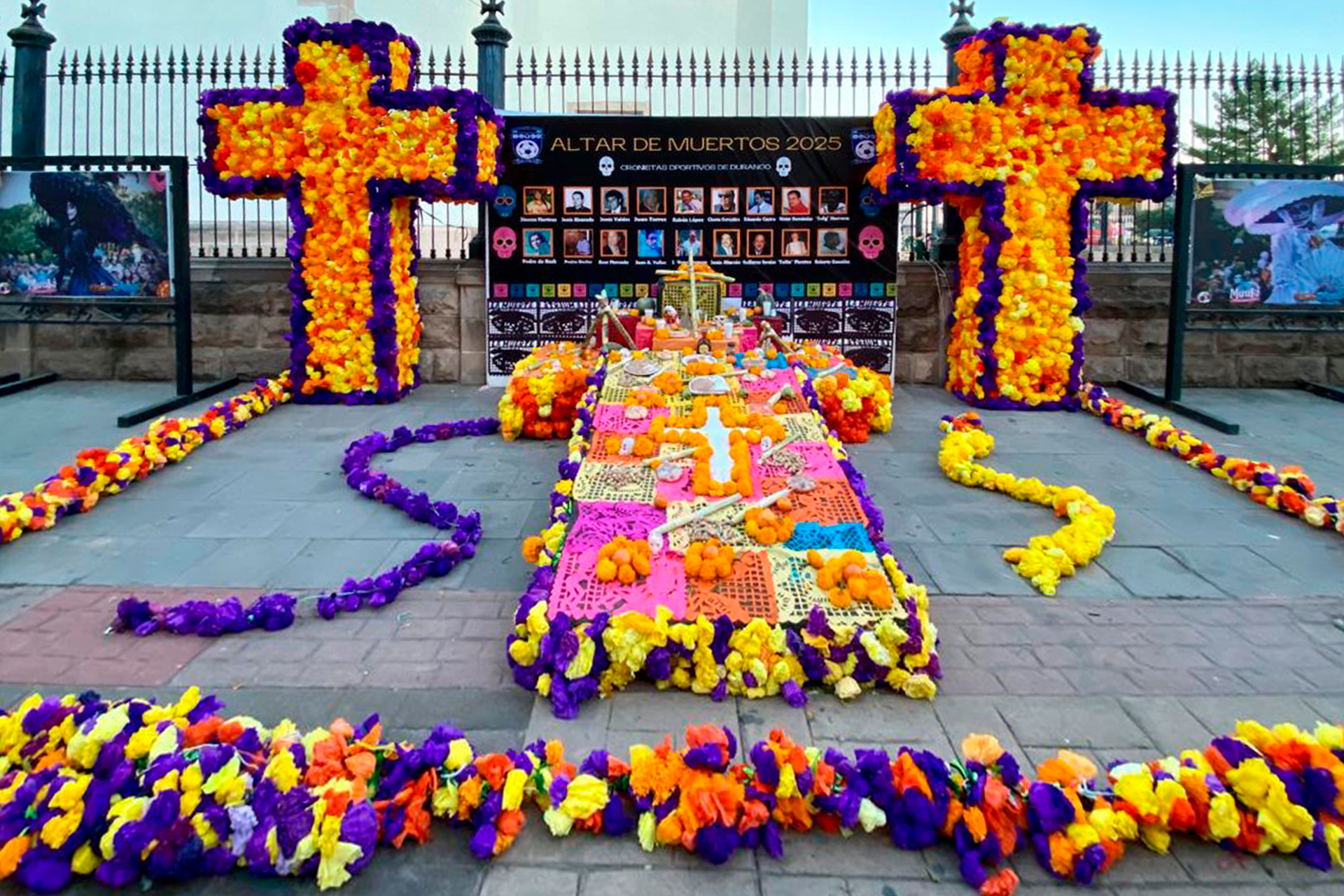 En el marco de las festividades del Día de Muertos, la Asociación Duranguense de Cronistas Deportivos (Aducrode) presentó su tradicional Altar de Muertos 2025, instalado a un costado de la Catedral Basílica Menor. Con un despliegue lleno de color, flores de cempasúchil, papel picado y símbolos del oficio periodístico, este homenaje rinde tributo a quienes dejaron una huella imborrable en la historia de la crónica deportiva de Durango.