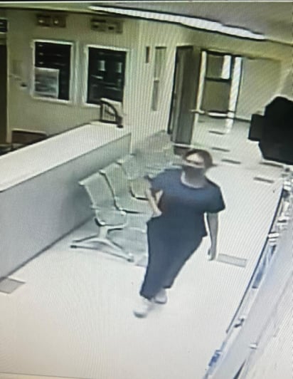 La fémina, de cabello agarrado y con cubrebocas, camina por los pasillos del hospital y se observa en actitud sospechosa, aparentemente observando el lugar.