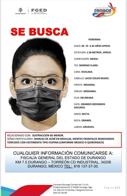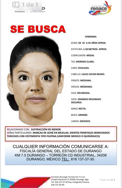 Esta madrugada, la Fiscalía General del Estado de Durango difundió el retrato hablado de la mujer presuntamente responsable de la sustracción de una bebé del Hospital Materno Infantil.