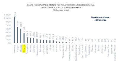 En la lista de entidades con mayores montos por solventar, Veracruz encabeza con mil 115 millones de pesos, seguido de Chiapas (678.5 mdp), Hidalgo (603.8 mdp) y Durango (416.6 mdp). Más abajo aparecen Chihuahua, Morelos, Coahuila, Nuevo León, Tabasco y Michoacán.