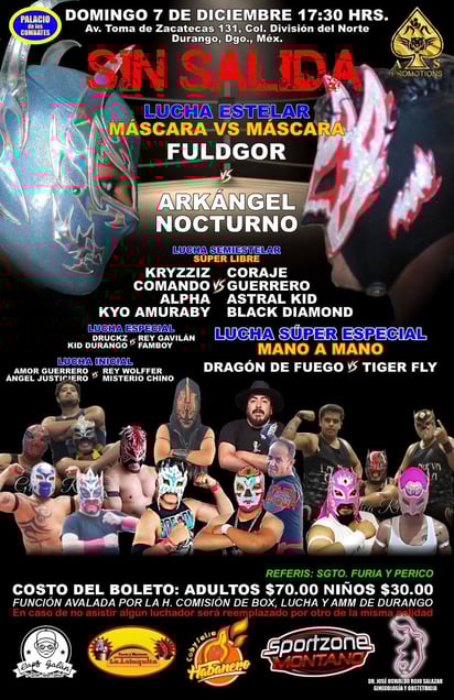 Este domingo 7 de diciembre, El Palacio de los Combates abrirá sus puertas para recibir Sin Salida, una función de Lucha Libre que promete emociones al límite, vuelos espectaculares y apuestas de alto calibre. Bajo la promoción de AS Promotions, la velada reunirá a exponentes de distintas escuelas y generaciones, en duelos pactados a dos de tres caídas sin límite de tiempo, con el aval de la Honorable Comisión de Box, Lucha y MMA de Durango.