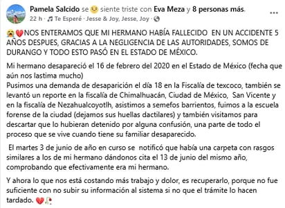 "Pusimos una denuncia de desaparición el día 18 en la Fiscalía de Texcoco, también se levantó un reporte en la Fiscalía de Chimalhuacán, Ciudad de México, San Vicente y en la Fiscalía de Nezahualcóyotl, asistimos a semefos, fuimos a la escuela forense de la ciudad (dejamos sus huellas dactilares) y también visitamos estaciones de policía para descartar que lo hubieran detenido por alguna confusión, una parte de todo el proceso que se vive cuando tienes un familiar desaparecido", publicó Pamela Salcido, hermana de Alfredo.