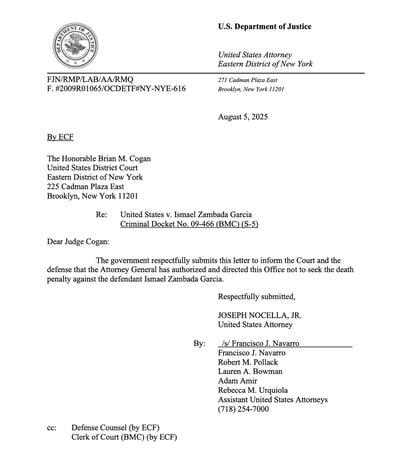 "Querido juez Cogan: el gobierno respetuosamente presenta esta carta para informar a la corte y a la defensa que la fiscal general ha autorizado y ordenado a esta oficina no buscar la pena de muerte en contra del acusado Ismael Zambada García", se lee.