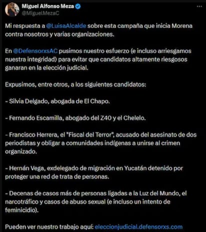 Al respecto, Miguel Alfonso Meza, presidente de Defensorxs AC lamentó esta campaña de desprestigio contra asociaciones y respondió que arriesgaron su integridad para evitar que candidatos altamente riesgosos ganaran en la elección judicial, al exponer a personas juzgadoras.
