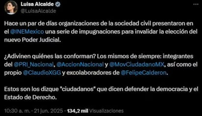Luisa Alcalde, dirigente nacional de Morena, acusó a las organizaciones de la sociedad civil que impugnaron la elección de la Suprema Corte de Justicia de la Nación (SCJN), el Tribunal de Disciplina Judicial y la Sala Superior del Tribunal Electoral, de estar ligadas a partidos de la oposición.