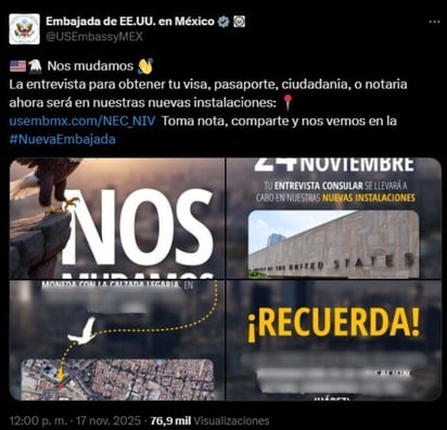 No obstante, durante el puente por la Revolución Mexicana se anunció que la nueva sede de la Embajada estadounidense cambió de ubicación, por lo que las personas que están en proceso o tienen cita para obtener ese documento tendrá que tomar en cuenta.