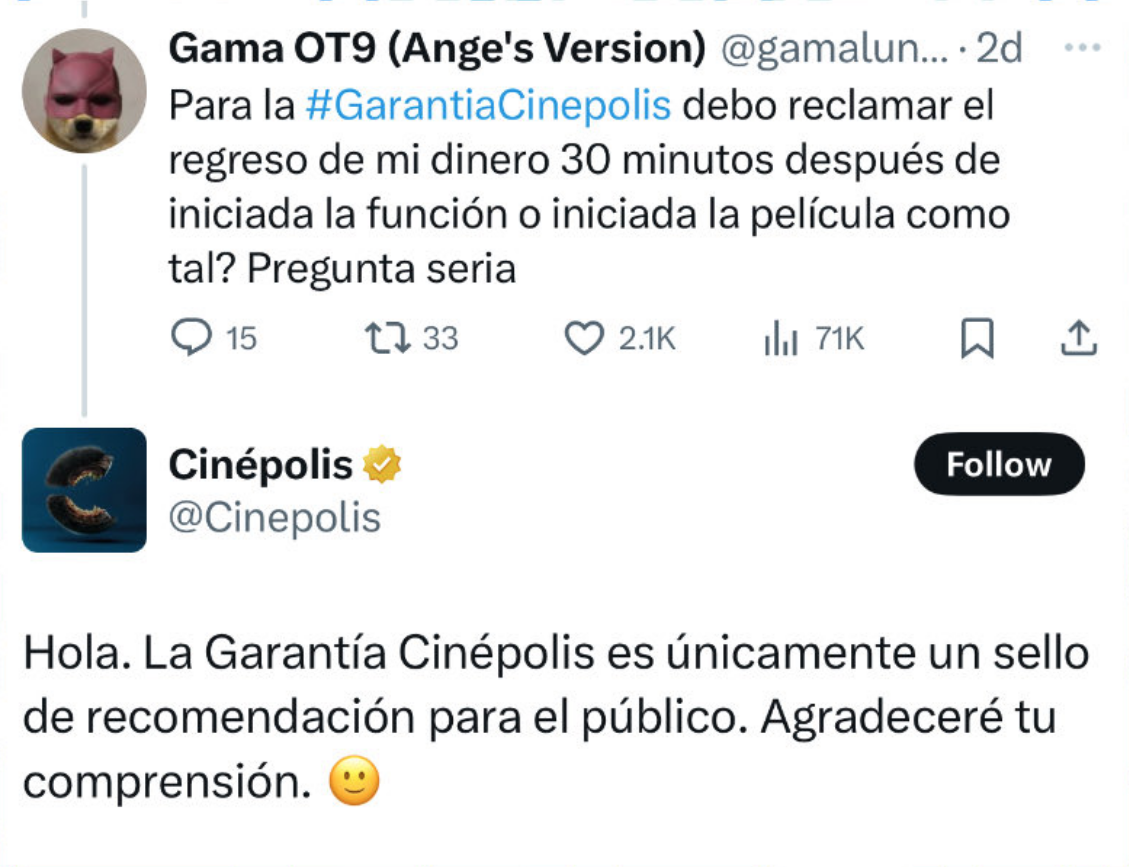 En un comunicado reciente, la cadena indicó que la “Garantía Cinépolis” no significaba un reembolso, pues aunque en el pasado se hacían devoluciones bajo ciertas circunstancias, esta práctica ya no se encuentra vigente, y no se realizan una vez iniciada la película.