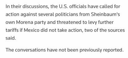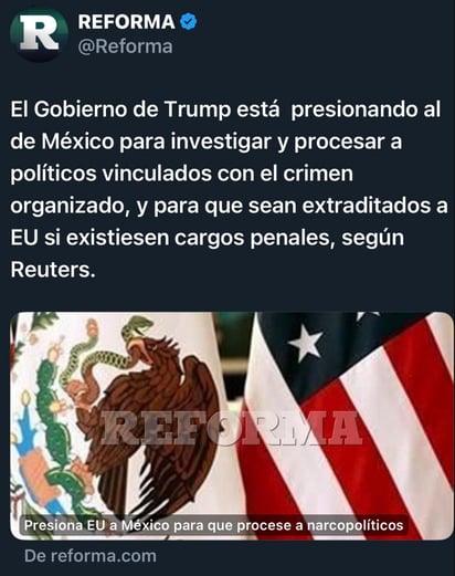 En su nota “Estados Unidos presiona a México para que procese y extradite a políticos con vínculos con cárteles”, Reuters señala que “el Gobierno del Presidente Donald Trump está presionando al de México para que investigue y procese a políticos con presuntos vínculos con el crimen organizado, y para que los extradite a Estados Unidos si existiesen cargos penales allí, según fuentes familiarizadas con el asunto”.