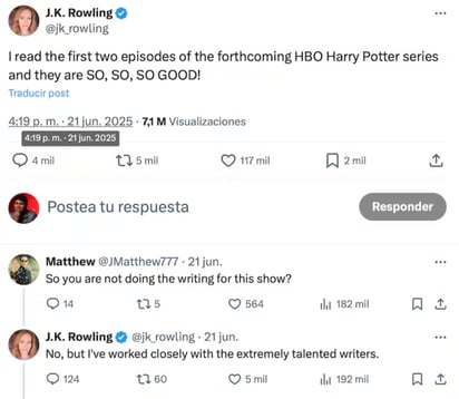 A través de su cuenta de X, J.K. Rowling dio su opinión en torno a los primeros capítulos de Harry Potter de Max. La autora ya leyó el primer guión de la serie y expresó “Son muy, muy buenos”.