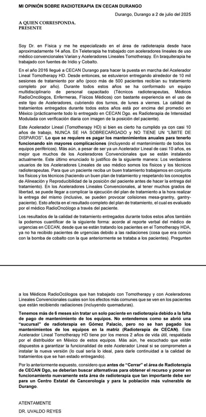 Y cierra su escrito diciendo que antes de “cerrar” el área de Radioterapia del Cecan se debería de buscar alternativas para obtener el recurso y poner en funcionamiento nuevamente esta área.