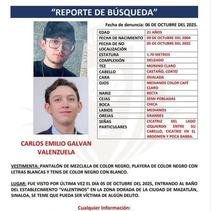 Este domingo 19 de octubre se cumplen dos semanas de que el duranguense Carlos Emilio Galván Valenzuela desapareció en el puerto de Mazatlán, Sinaloa.