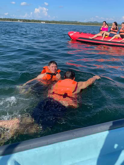 En ellas se le observa con un chaleco salvavidas, esperando su turno para ingresar al mar. Mientras que en otra, está disfrutando de nadar.