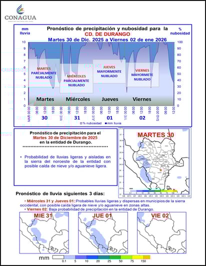 De acuerdo al informe emitido por la Comisión Nacional del Agua (Conagua) local, el estado de Durango mantiene la probabilidad de caída de nieve o aguanieve durante el miércoles 31 de diciembre y el jueves 1 de enero de 2026.