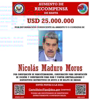 El gobierno de Estados Unidos anunció hoy una recompensa de 50 millones de dólares por información que conduzca al arresto del presidente de Venezuela, Nicolás Maduro.