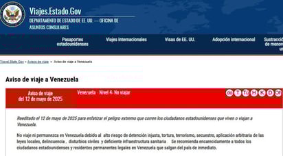 “No viaje a Venezuela ni permanezca en el país debido al alto riesgo de detención ilegal, tortura durante la detención, terrorismo, secuestro, aplicación arbitraria de las leyes locales, delincuencia, disturbios civiles y deficiente infraestructura sanitaria”, señala la alerta.